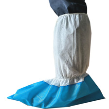 脚踝橡筋,行动更方便,不掉跟。脚底蓝色覆膜,防滑耐磨防水。白色腿部材料,透气舒适,属于半覆膜鞋套的升级款。